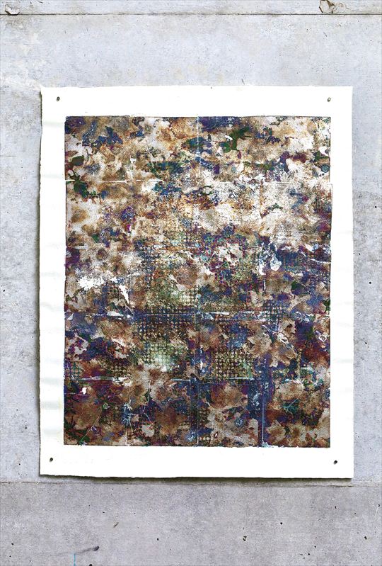発酵した植物1 2024 いずみ紙に水性インク、本銀箔、キッチンハイター 100×148mm |