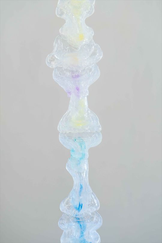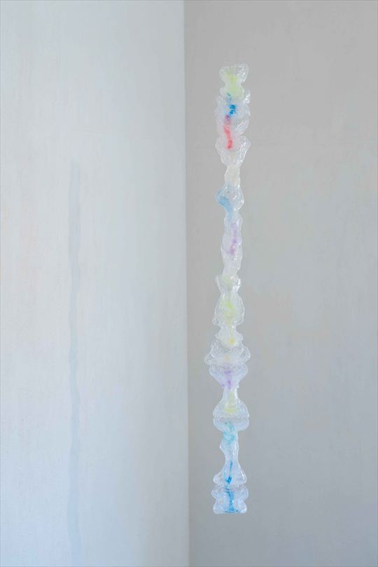 林 葵衣 個展 くばせのつらなり HAYASHI Aoi solo exhibition Shape of Dialogue 2025年10月3日(金)から12日(日) 12:00から18:00 月曜日休み KUNST ARZT では、3年ぶり4度目となる 林葵衣の個展を開催します。 林葵衣は、口紅の痕跡絵画や 口腔内オブジェを通して、 言葉を視覚化するアーティストです。 本展では、口内で硬化させた ポリエチレン樹脂製オブジェに 「時間」を与える試みです。 口腔内オブジェをワイヤーなどでつなぐことで、 その発音された言葉と言葉の間の時間、 無言の時間など、より実際の発話のタイミングを 視覚化することが可能となり、 そのワイヤーが複数になることで、 対話を再現することも構想しています。 (KUNST ARZT 岡本光博) 展覧会コンセプト 目くばせ、気くばせなどの言葉に使用される 「くばせ」とは元来「くわせ」「くはす/食わす」 から変化した言葉である。 目の前の相手と対話するため体内から 言葉を引き出そうとする時、言いよどんだり、 つかえたり、途切れたり言い間違えるのは、 自分が伝えたい言葉を対話相手が 食べやすいよう形を整えるうちに溢れてしまう 身体の身振りなのかもしれない。 選びきれない言葉、不恰好な声、整 わない呼吸が一本の連なりとして 口から吐き出された様子を提示する。 PRESS RELEASE HAYASHI Aoi (b.1988, Kyoto pref, lives and works in Kyoto) is an artist who focuses on the movement of the lips and the production of sound when uttering words. She earned her MA at Kyoto University of the Arts. 作家による解説 本展では、口から発せられる言葉や 声を視覚化する作品を展示しています。 タイトルに名付けた「くばせのつらなり」のくばせとは、 平安時代に「目をくはす〔食わせる〕」という言い方がみられ、 これが「目で合図して知らせる」ことだと 考えられていると知ったことから来ています。 相手に自分の言葉を食べさせること。 これは、1人で食べる適当な食事のような、 または標本のような完結した独り言とは異なります。 他者と対話することは、身構えたり、姿勢を丁寧にしたり、 言葉を整えながら発したとしても、なまなましく、整わず、 どこか不恰好になってしまうものだと考えています。 その姿勢や、声のねじれ、ひずみ、無言の間を 造形化したくてこのような作品を制作しています。 会場に展示されている立体作品は、 温めると柔らかくなり冷やすと固まる ポリエチレン樹脂を使用しています。 この樹脂を自身の口の中に入れ、 一音節や単語などの言葉を発音し、口中の型を取り、 吐き出したものを言葉の彫刻としています。 樹脂と木材やアルミなどの異素材を組み合わせることで 言いよどみや言葉に詰まる様子を表現する 《Phonation Piece -Distortion-》シリーズ、 あくまでも家族の何気ない会話ですが、 仏師である父と摩利支天尊と呼ばれる 仏像について対話している様子を録音し、 発話内容を1人で言い直し、テグスで吊る事により 会話の時間軸、間を同時に再現する 《Phonation Piece -DIALOGUE-》、 しゃがみ、あおぎみ、とぶ、という体の動作と 制作時の造形や形態、空間での展示方法をリンクさせた 《Phonation Piece -SHAGAMI AOGIMI TOBU-(Distortion)》、 樹脂の両サイドから向かい合うように発声し 型取りを行った《Phonation Piece -FURERU-》、 言葉遊びのしりとりは最後と最初が同じであり、 造形として接続が容易で、単語を積み上げやすいことから 着想した《Phonation Piece -SIRITORI-》を展示しています。 樹脂の色彩は、熱を加え柔らかくする際に、 透明色と色付きの樹脂を同時に混ぜ造形しています。 色付けをすることで発話する人物や、 単語ごとの見分けを行うことができ、 かつ彫刻内部の造形が見えやすくなります。 意味をなさない言い間違い、 1分にも満たないささやかな対話の時間や、 他愛ない言葉遊びのしりとりをモチーフとすることは、 自分が暮らす様々な外部環境の影響を受けたうえで、 尚且つ発される、自分自身を発信源とする 個人的な声であることを何よりも重視しているからです。  |