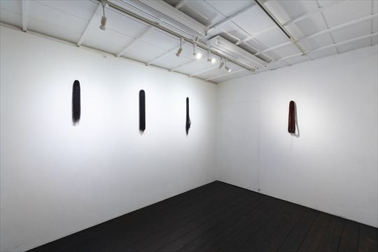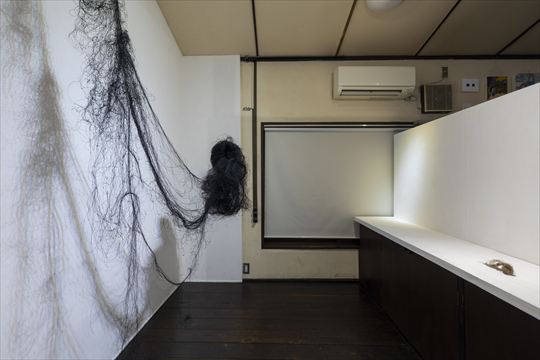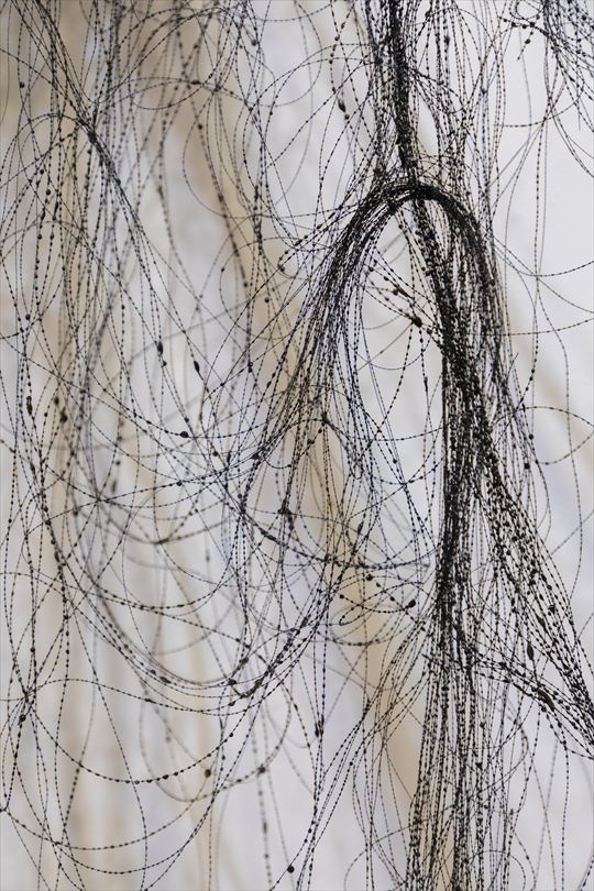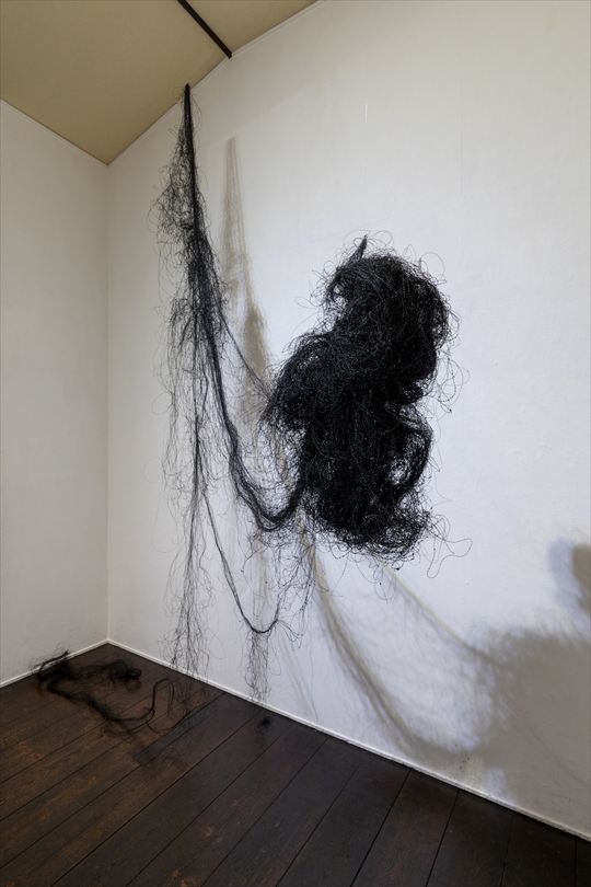 不断髪 2017 漆、絹糸 h400,w200,d450cm 黒の漆糸を、断ち切ることのない 長い髪の毛に例えて制作した。 |