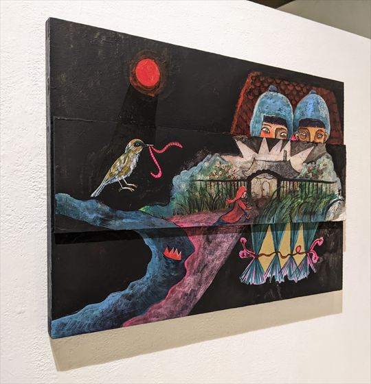 赤い月の家 2025 バネルにアクリル絵具、木材、紙、ペン、木、ワニス 44.5×33.4×2.8p |