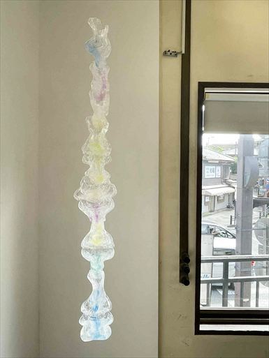 井阪郁 ISAKA Kaoru たもちNo.1 2025 綿布,染料,顔料,糸 35×35×45p 75,000円 華道を嗜む中で、ゴージャスすぎる壺を使った生け花への違和感をポップなソフトスカルプチャーで。 題の「たもち」は、骨組みの無い構造でギリギリ自立させ、カタチを「たもつ」ことができるかどうかから。 |