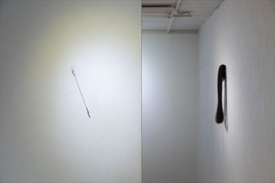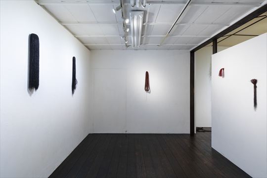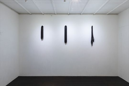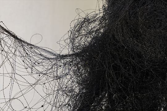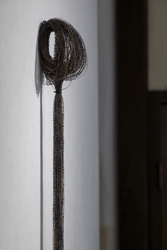 不断髪 2017 漆、絹糸 h400,w200,d450cm 黒の漆糸を、断ち切ることのない 長い髪の毛に例えて制作した。 |