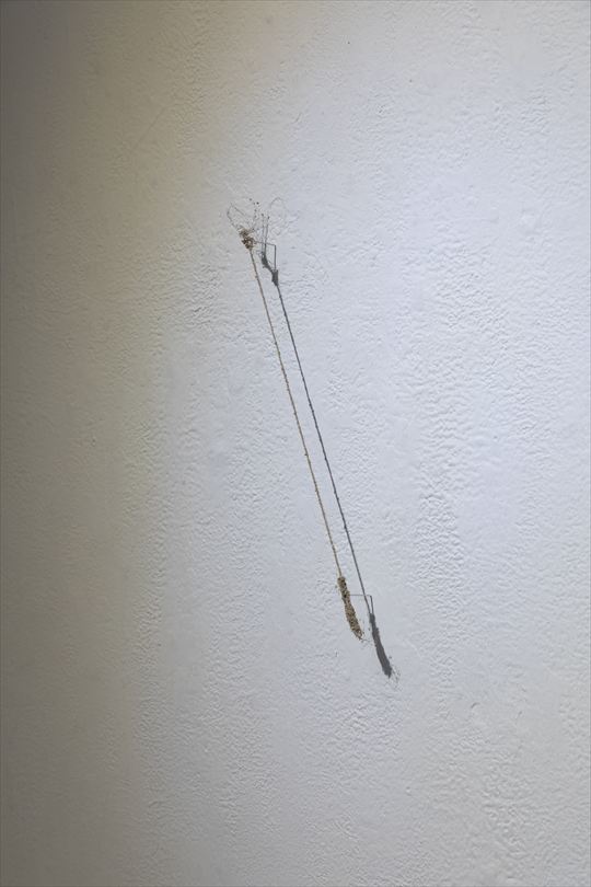 アーティスト ステートメント 雨の日に蜘蛛の巣に水滴がつく様子から着想を得て、 蜘蛛の糸と似た成分を持つ絹糸を使い、漆を塗った。 漆は表面張力によって球体になり、 絹糸には無数の漆玉が発生した。 水滴はやがて蒸発して消えるが、 漆玉は漆が空気に触れることで固まり、その場に形が残る。 私はこれを「漆糸」と呼ぶ。 漆糸を空間の重力にさらし、 素材や自然現象と向き合うことは まだ私の知らない漆を知る手がかりになると考える。 |