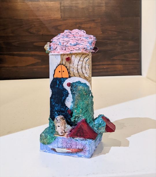鳥を探す石 2025 木材にアクリル絵具、紙、布、ビーズ 7.5×12×4p 以上、個展「ベニの家の自分の洞窟」2025 より |
