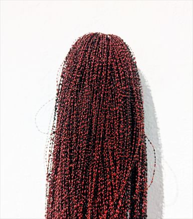 森田志宝 MORITA Shiho 漆束-4 Urushi Bundle-4 2025 漆・絹糸・針金 lacquer, silk thread, wire 13×96×9cm 121,000 円 『漆玉』を束ねる連作の1つ。 束ねることで、髪の毛感というか 生き物的な存在感が出てきます。 赤漆は血液のようにも見え、 痛々しい漆採取を彷彿させます。 |