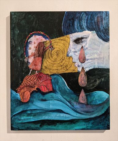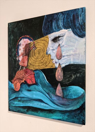 村上ルミ MURAKAMI Rumi うずまきの海 Sea of spiral 2025 パネルにアクリル絵具、紙、ペン、木炭、ワニス acrylic paint, paper, pen, charcoal, varnish on panel 38×45.5×2p 60,000円 絶望の涙を利用して、一筋の希望に向けて進むシーン。 |