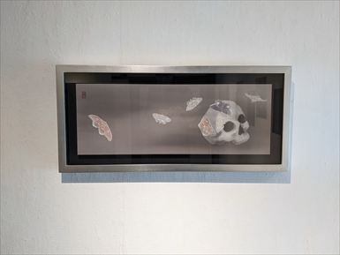 碇栞奈 IKARI Kanna いざない Invitation 2024 絹、墨、胡粉、岩絵具 242×666 o 額 780×357×50 o 110,000 円 額込み 蛾が乱舞し、生前の華やかさを感じさせます。 |