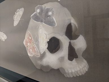 マルボロのボロ箱とシケモクという ゴミを刺繍と染めで表現。 ハンスハーケ&ダミアンハーストの モチーフであることも 作品レイヤーの一つです。 |