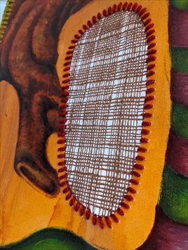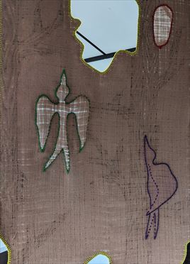 【BEST BUY!】 どばし ほのか DOBASHI Honoka 熟すかな 飛べるといいね 落ちる前に 2025 キャンバスに油彩、木炭、ドンゴロス、 糸、鉄、ビーズ 1800×900mm \ 150,000 吊り下げ油彩絵画。 表には2匹の鳥、 裏は木炭で描かれた木と 鳥たちが縫い込まれた 2層になってます。 |